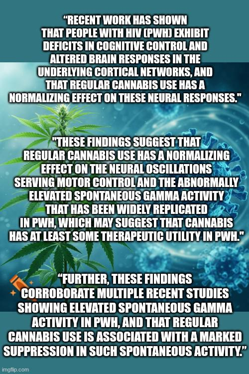 “The current study found evidence of multiple novel interactions between cannabis use and HIV status in beta and gamma interference responses across a broad network of brain regions. Further, these findings corroborate multiple recent studies showing elevated spontaneous gamma activity in PWH, and that regular cannabis use is associated with a marked suppression in such spontaneous activity.”