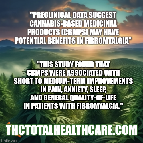 Conclusions: There was an association between treatment with CBMPs and improvements in pain, anxiety, sleep, and general quality of life. The high incidence of AEs in relation to other patient cohorts from the UKMCR may relate to the central sensitisation mechanism of fibromyalgia. Key Points • This study found that CBMPs were associated with short to medium-term improvements in pain, anxiety, sleep, and general quality-of-life in patients with fibromyalgia. • More randomised controlled trials are warranted to consolidate the literature, but this large analysis provides real-world data to inform their rollout.”