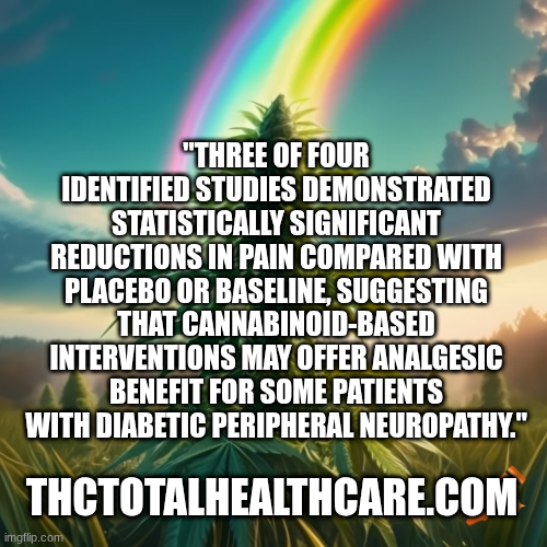“three of four identified studies demonstrated statistically significant reductions in pain compared with placebo or baseline, suggesting that cannabinoid-based interventions may offer analgesic benefit for some patients with diabetic peripheral neuropathy.”