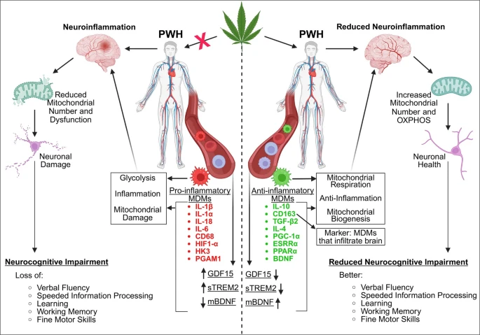 Thus, cannabis use may mitigate NCI in PWH by immunometabolically reprogramming MDM function towards an anti-inflammatory and neuroprotective state.”