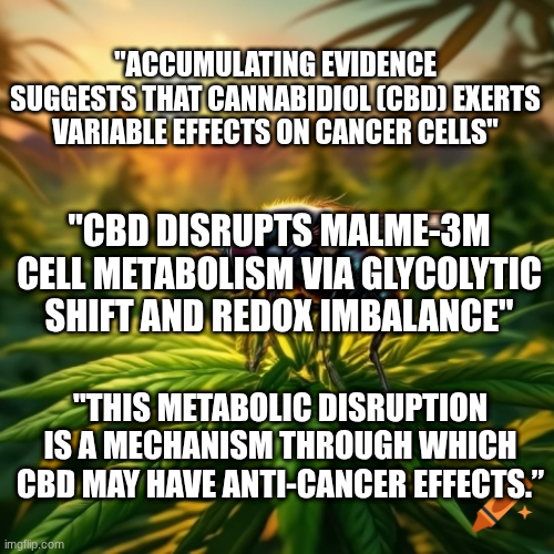 “This title means that the compound cannabidiol (CBD) disrupts the metabolism of Malme-3M cancer cells by forcing them to switch from their normal energy-producing processes to a more primitive, less efficient one called glycolysis, and by throwing off their cellular “redox” balance (a state of chemical reactions that are key to maintaining cell health). This metabolic disruption is a mechanism through which CBD may have anti-cancer effects.”