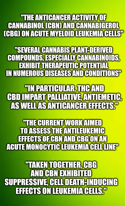 Taken together, CBG and CBN exhibited suppressive, cell death-inducing effects on leukemia cells. However, further in-depth research will be needed to explore the molecular mechanisms driving the anticancer effects of CBN and CBG in the leukemia setting.”