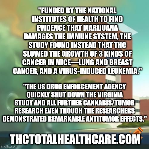 “Funded by the National Institutes of Health to find evidence that marijuana damages the immune system, the study found instead that THC slowed the growth of 3 kinds of cancer in mice—lung and breast cancer, and a virus-induced leukemia. The US Drug Enforcement Agency quickly shut down the Virginia study and all further cannabis/tumor research even though the researchers demonstrated remarkable antitumor effects.”